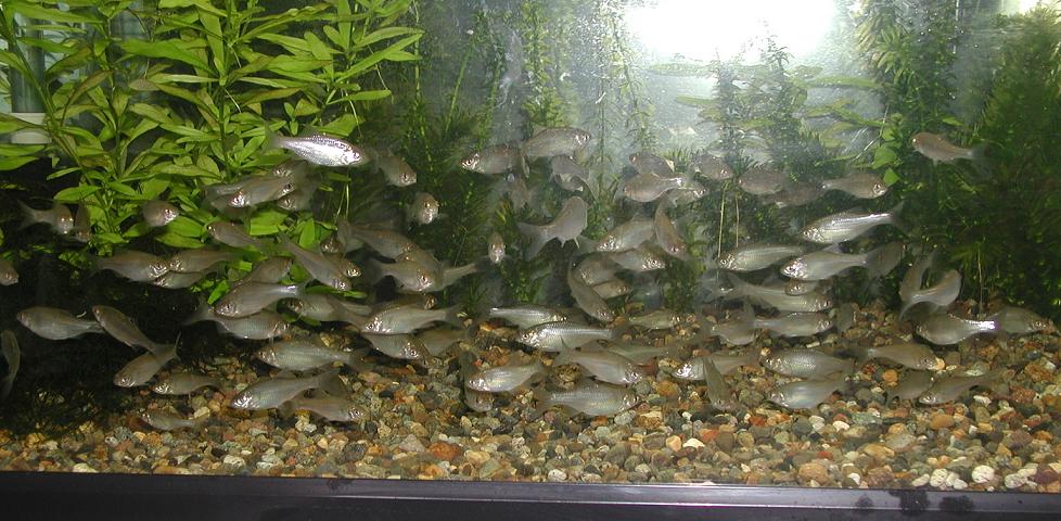 上段の水槽には、ヤリタナゴなど百数匹が入っています。